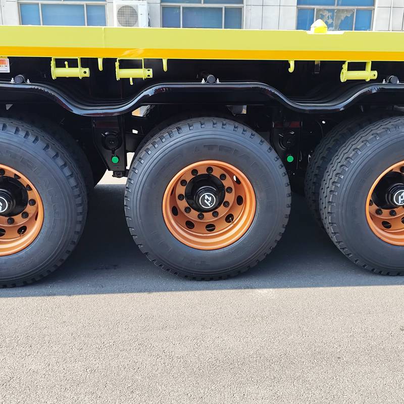 The 3 axles container flatbed trailer uses 315/80R22.5 tires and 16mm thick gold rims. These gold wheels add a luxurious and refined feel to the semi-trailer, elevating the vehicle's overall class and creating a refined, high-end feel. Gold wheels typically undergo special surface treatments, such as electroplating and anodizing, for superior corrosion resistance. This effectively prevents rust and corrosion in harsh environments like humidity and salt spray, extending their lifespan and reducing maintenance costs.