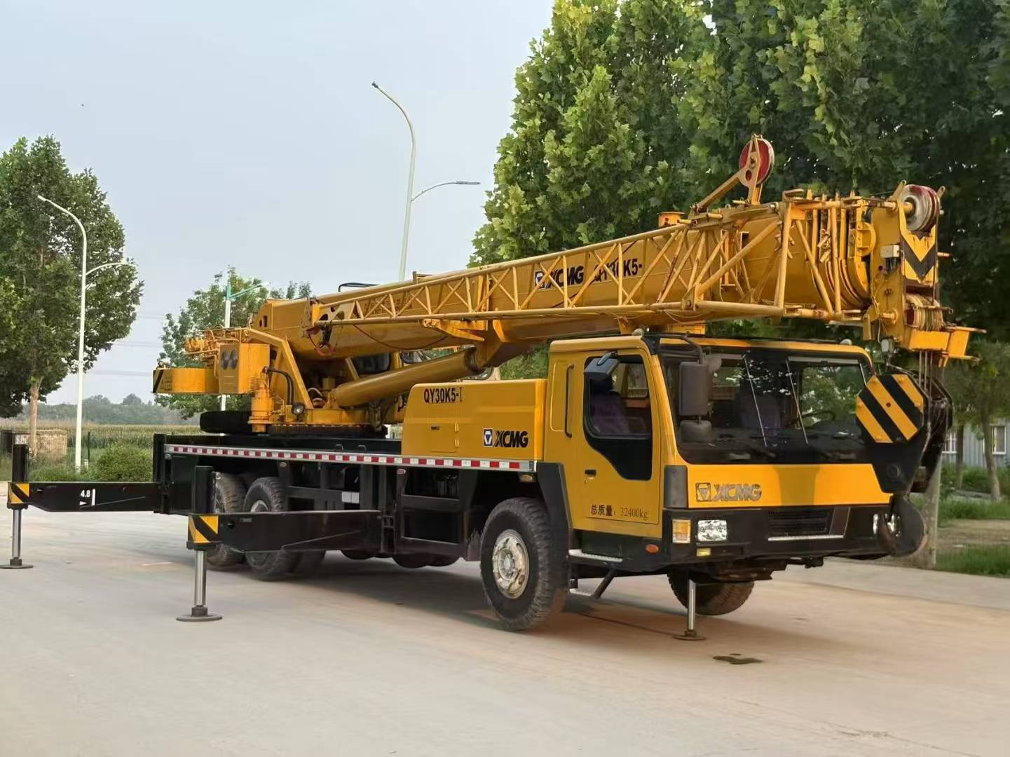 The XCMG QY30K5 is a 30-ton truck crane with a main boom length of 32.5 meters. It is used in construction projects, logistics yards, and urban infrastructure maintenance for lifting building materials, machinery, and equipment. The crane has a transport length of 12.35 meters and a transport height of 3.45 meters, allowing it to operate in space-limited environments. Its weight is 32.4 tons.