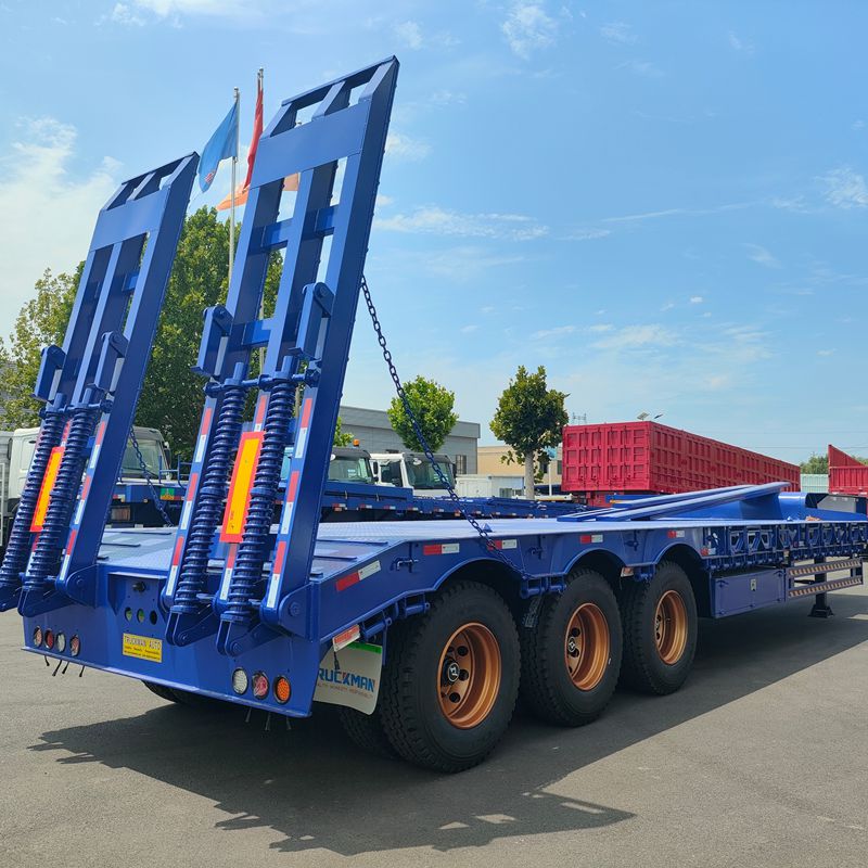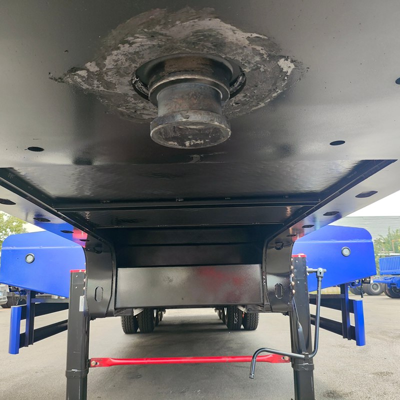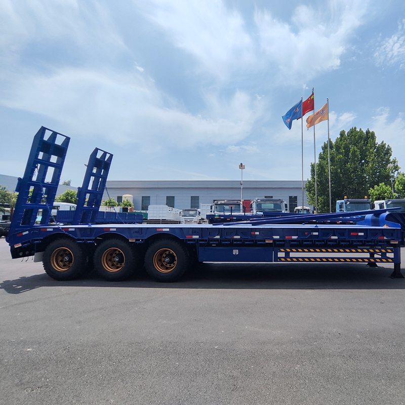 This 3-axis 50-ton low flatbed semi-trailer 4 is suitable for transporting heavy equipment, large steel components and other goods. It is equipped with ZY axles, triangular tires and WABCO braking system. The cross-bracing of the frame is dense, the main beam is widened, the rim is thickened and durable, featuring high load-bearing capacity and safety, and is suitable for material transportation in multiple industries.