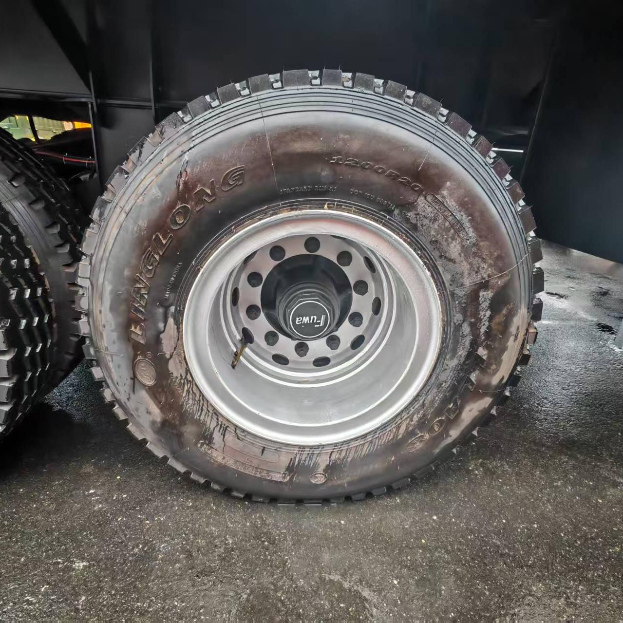 The 3-axles flatbed trailer uses 12R22.5 tires and thicker 16mm gold wheels. The larger wheel size and wider tires increase the vehicle's contact area with the ground, improving vehicle stability during driving, especially when driving at high speeds or cornering.They can effectively reduce vehicle roll and sway, lower the risk of vehicle loss of control, and improve driving safety.The 16mm thick steel ring has a stronger load-bearing capacity and is suitable for users to use when pulling heavy loads.