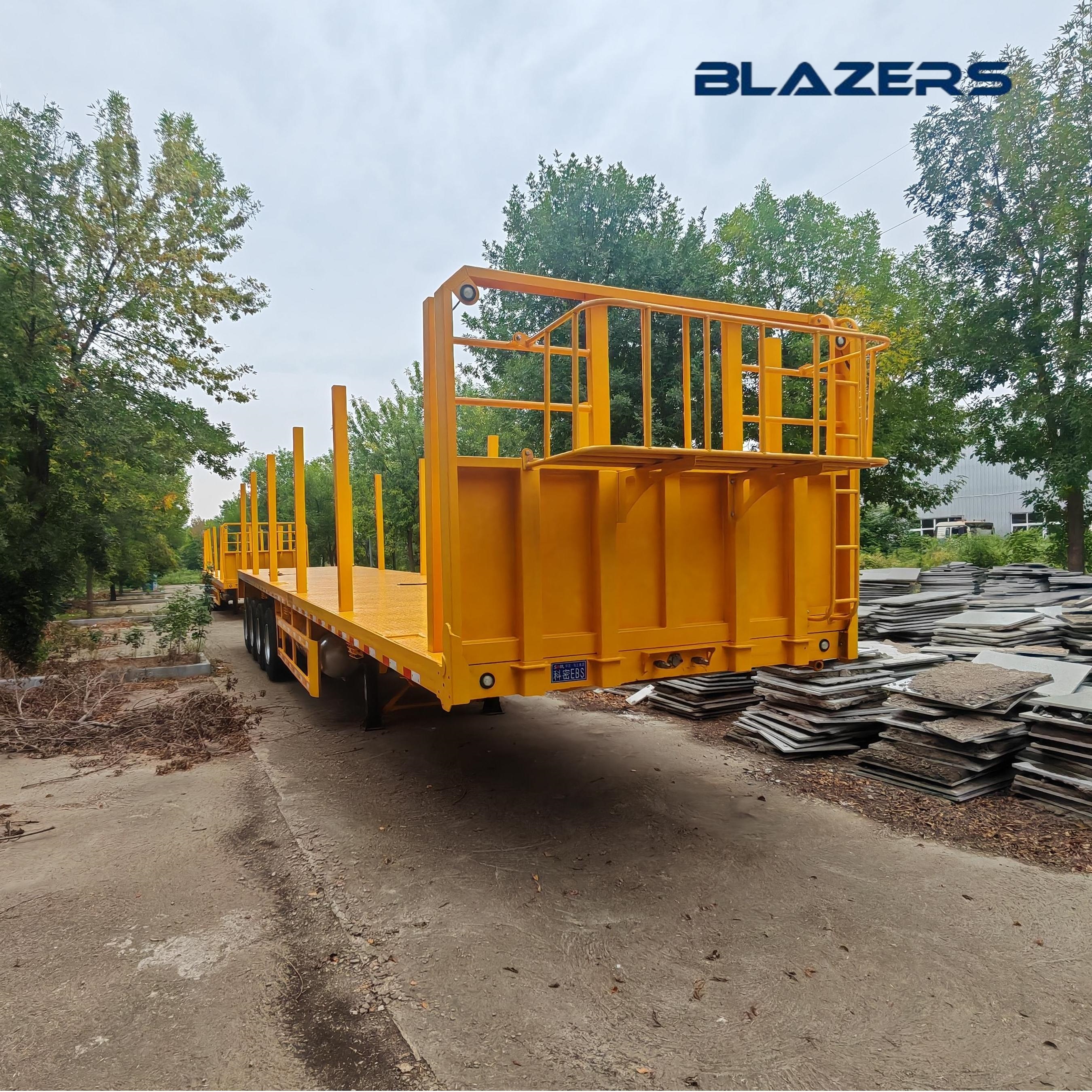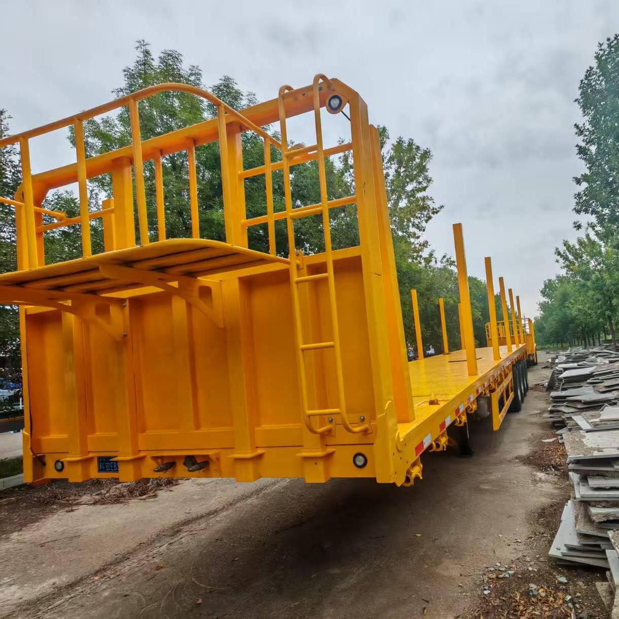 The 4 axles 70 tons flat-bed trailer is a flat-bed trailer for medium and long-distance transportation. It can be used to transport containers and bulk goods such as daily necessities and cement bags. The whole vehicle is made of high-strength steel and has a strong carrying capacity. The lightweight design reduces the vehicle's own weight, can load more goods, and improve customers' transportation efficiency. All accessories are from well-known brands, with guaranteed quality and longer service life.