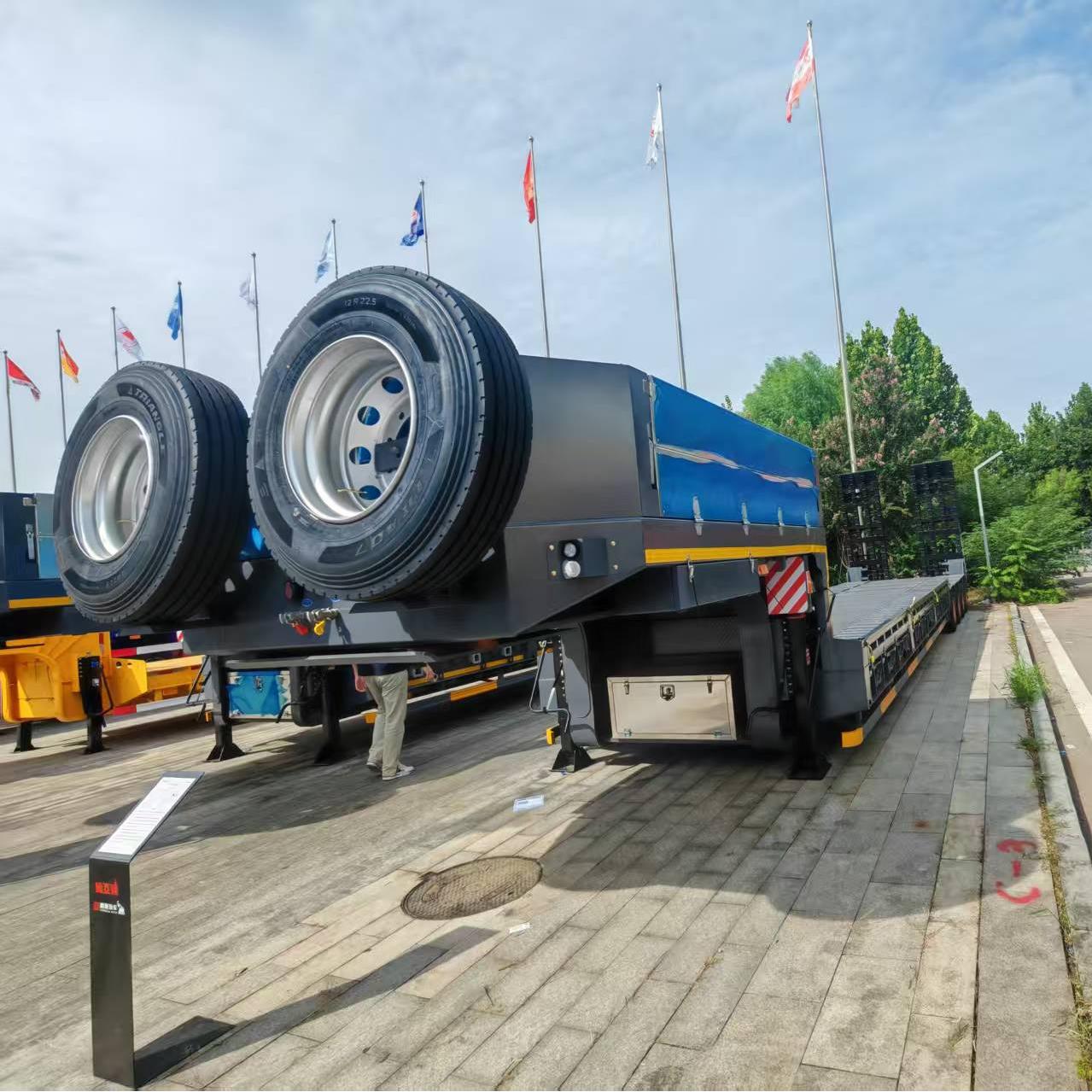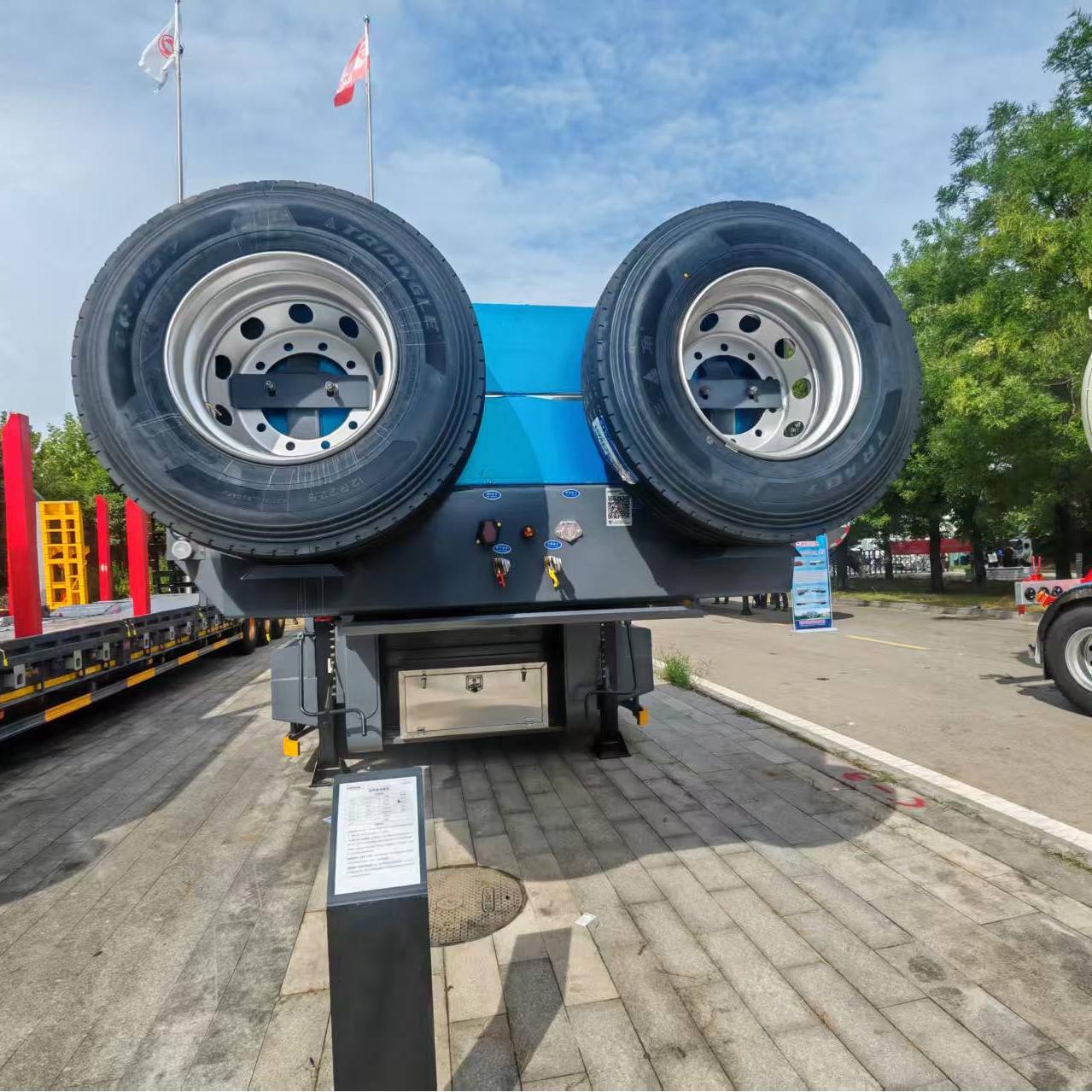 The 3-axles flatbed trailer uses 12R22.5 tires and thicker 16mm gold wheels. The larger wheel size and wider tires increase the vehicle's contact area with the ground, improving vehicle stability during driving, especially when driving at high speeds or cornering.They can effectively reduce vehicle roll and sway, lower the risk of vehicle loss of control, and improve driving safety.The 16mm thick steel ring has a stronger load-bearing capacity and is suitable for users to use when pulling heavy loads.