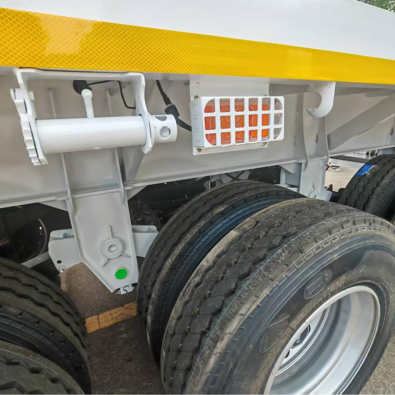 The 3-axles flatbed trailer uses 12R22.5 tires and thicker 16mm gold wheels. The larger wheel size and wider tires increase the vehicle's contact area with the ground, improving vehicle stability during driving, especially when driving at high speeds or cornering.They can effectively reduce vehicle roll and sway, lower the risk of vehicle loss of control, and improve driving safety.The 16mm thick steel ring has a stronger load-bearing capacity and is suitable for users to use when pulling heavy loads.